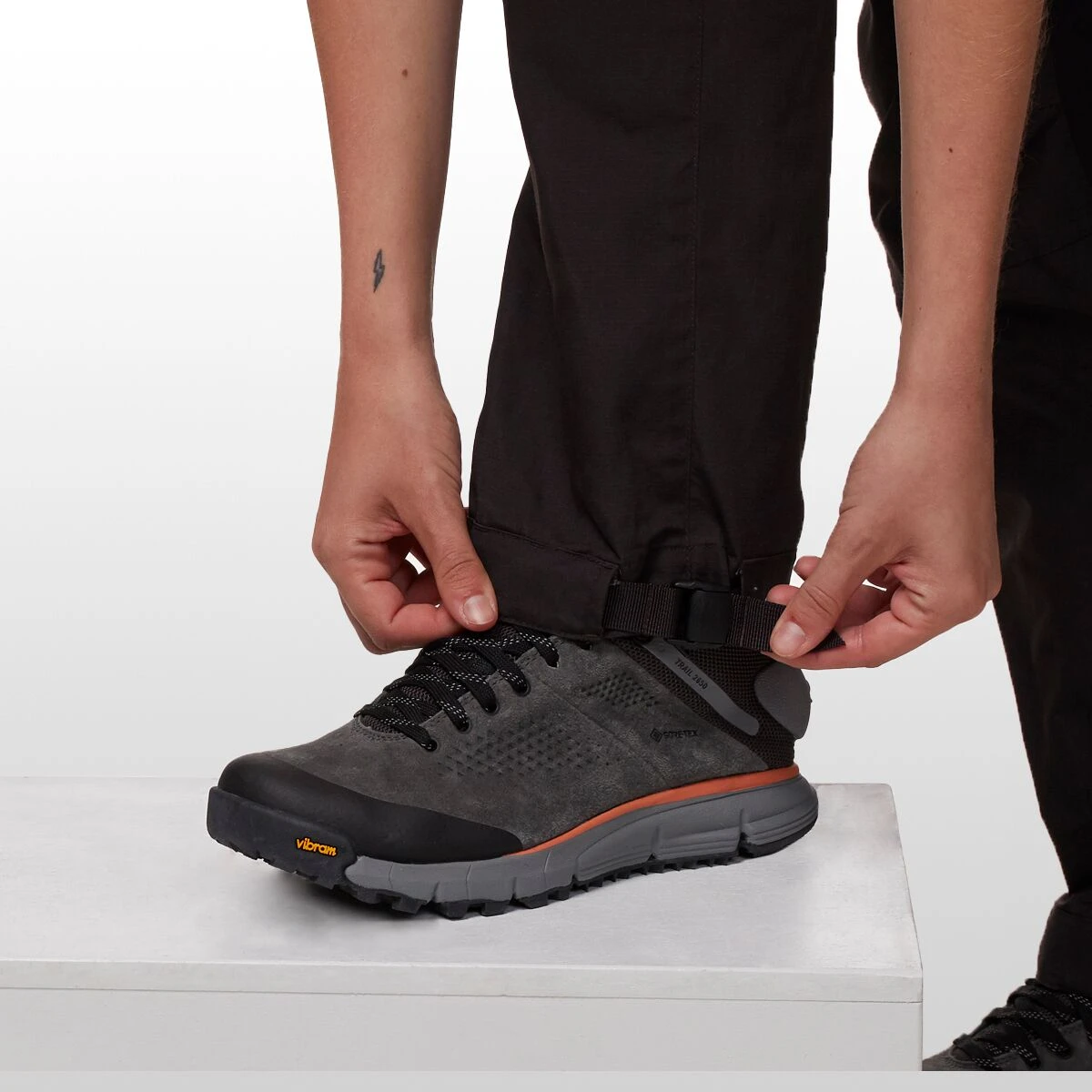 - Adjustable cuffs and hooks give a snug fit around hiking boots