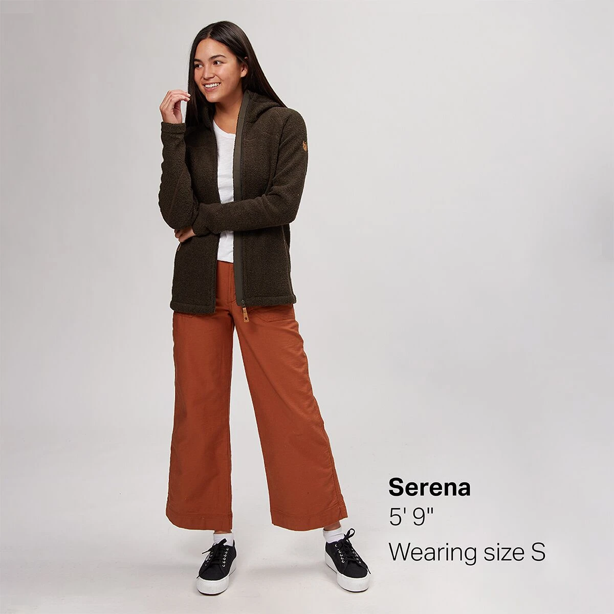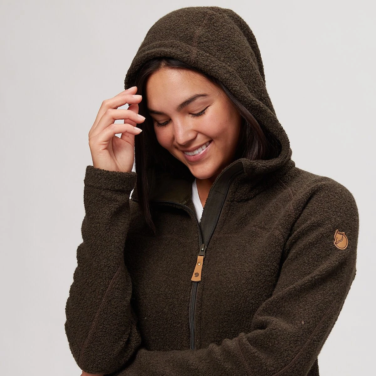 Trek through the mountains or around town in comfort with the Fjallraven Kaitum Fleece Jacket. The durability of polyester meets the comfort of and function of wool in this blend that wicks moisture and regulates temperatures. With the natural odor-resistant properties of wool, you can wear it under a shell or while unwinding after a day on the trails without having to worry about how you smell. After a long day, you can relax in comfort with a fleece-lined hood that keeps you cozy on chilly days or during low-output activities.