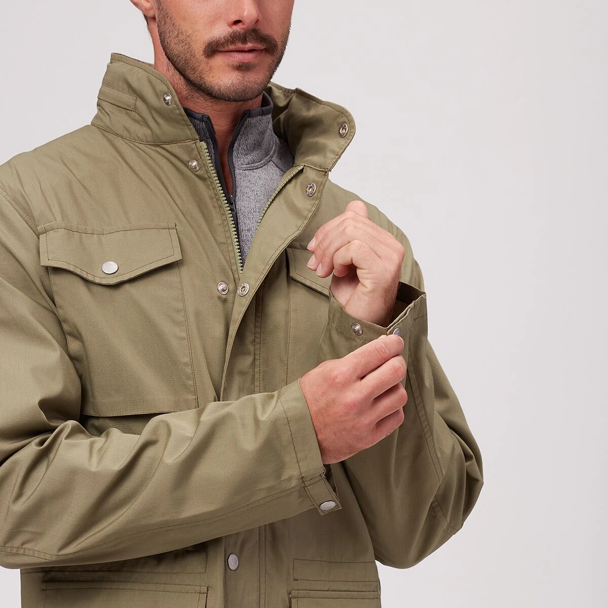 - Pockets: [external] 2 buttoned chest, 2 dual-entry hand, [internal] 1 zippered chest
